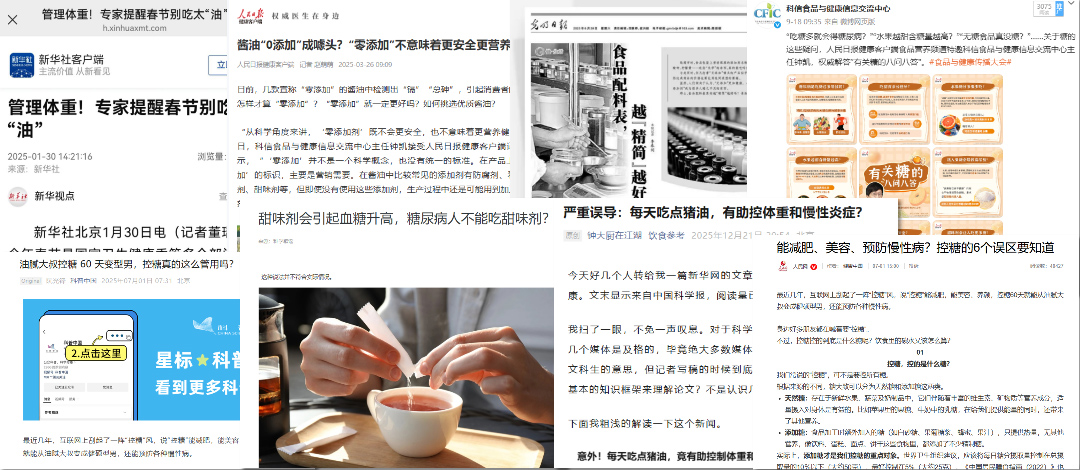 二是結合特定時間節點和社會熱點事件,利用多種渠道策劃相關話題傳播,通過新華社、人民日報健康客戶端、光明日報、經濟日報、科普中國等數十家中央權威媒體發布,涵蓋減油、體重管理誤區、糖與甜味劑辟謠等。