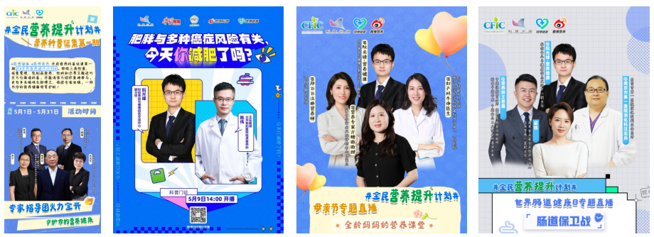 5 月,科信中心聯合科普中國和微博健康開展線上營養科普活動,旨在通過以科學界為主導,通過全社會、多渠道、集中力量、傳播核心營養知識,提高公眾健康素養。活動為期一個月,覆蓋四大主題(三高飲食,減重管理,乳制品營養,飲料知識),全站話題閱讀量超 1 億次。此外,結合行業日共開展了 3期線上直播,2 期圖文科普。