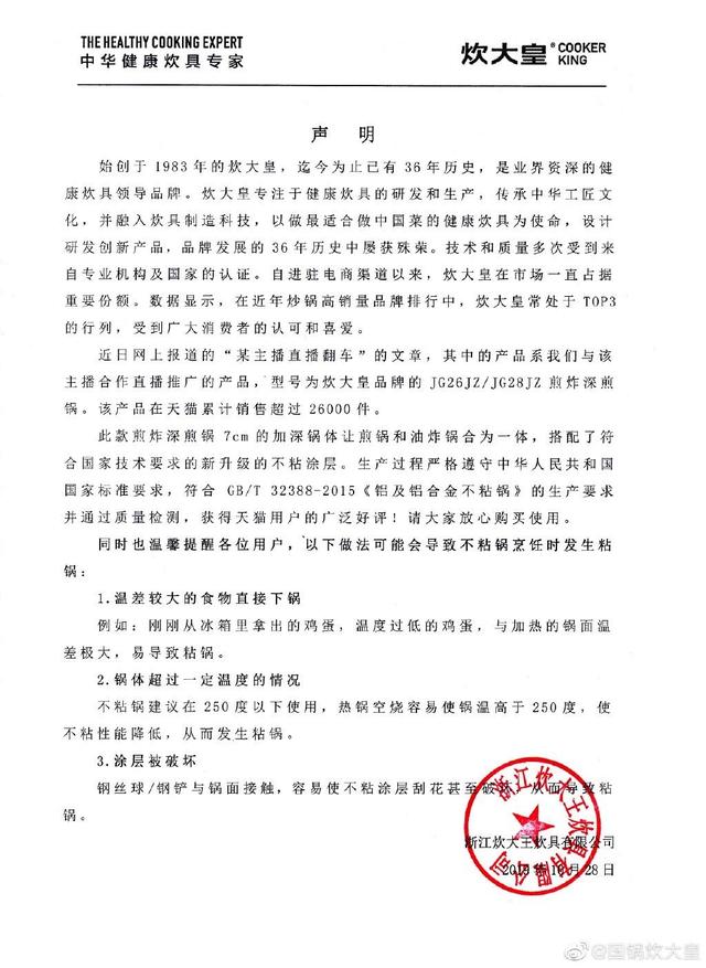 網(wǎng)紅翻車后,不粘鍋公司回應(yīng)稱是因為主播不會做飯,演示時沒有放油、雞蛋從冰箱冷藏拿出來,溫差太大,鍋的溫度太高;并在聲明中稱用來直播的鍋鍋符合GB/T 32388-2015《鋁及鋁合金不粘鍋》的生產(chǎn)要求并通過質(zhì)量檢測。主播的工作室則回應(yīng),推薦產(chǎn)品沒問題,粘鍋原因不便回復(fù)。