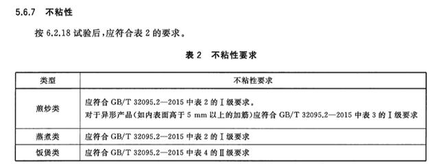 標(biāo)準(zhǔn)GB/T 32388-2015《鋁及鋁合金不粘鍋》中對鍋的不粘性要求是要符合GB/T 32095.2-201 《家用食品金屬烹飪器具不粘表面性能及測試規(guī)范 第2部分:不粘性及耐磨性測試規(guī)范》中表2的I級要求。