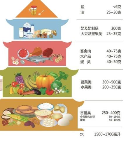蔬菜保證每天攝入300至500克,深色蔬菜應占1/2;水果保證每天攝入200至350克,果汁不能代替鮮果;奶制品攝入量相當于每天液態奶300克;豆制品每天攝入量相當于大豆25克以上,適量吃堅果。