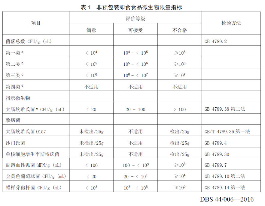 廣東地方標準對非預包裝即食食品微生物限量指標