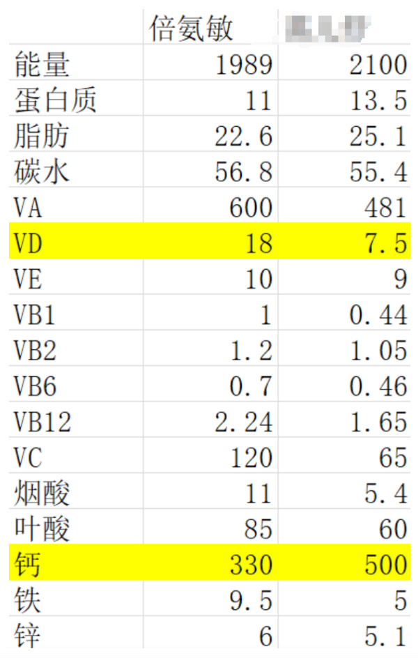 你可以看到,兩者確實不太一樣,但也沒有那么大差別,甚至不少微量營養素的含量比正規產品還多。尤其是 VD 的含量比正規產品多,而佝僂病主要是VD 缺乏引起,醫生診斷也是 VD 攝入不足。