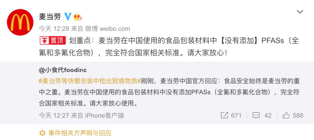 目前,麥當(dāng)勞和漢堡王均已回應(yīng):在中國使 用的食品包裝材料中沒有添加 PFASs,完全符合國 家相關(guān)標(biāo)準(zhǔn)。請(qǐng)大家放心!