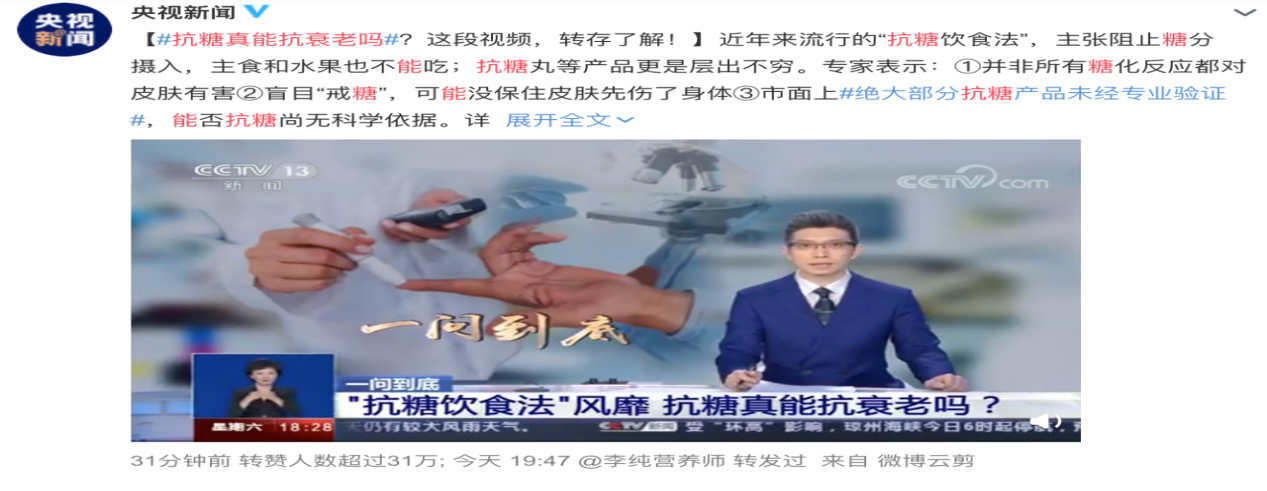 很多人在這些宣傳下對“糖”是更加深惡痛絕, 紛紛開始“抗糖飲食法”,甚至為了抗“糖”而完全戒糖。昨天央視做了一期節目專門探討抗糖到底能不能抗衰老。
