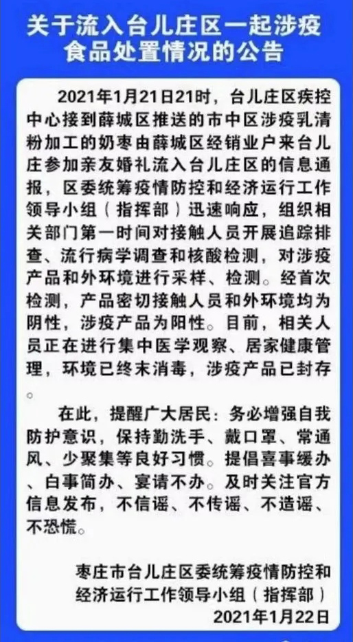 記者從山東省棗莊市臺兒莊區委統籌疫情防控和經濟運行工作領導小組(指揮部)了解到,2021年1月21日21時,臺兒莊區疾控中心接到薛城區推送的市中區涉疫乳清粉加工的奶棗由薛城區經銷業戶,來臺兒莊參加親友婚禮,流入臺兒莊區的信息通報,臺兒莊區委統籌疫情防控和經濟運行工作領導小組(指揮部)迅速響應,組織相關部門第一時間對接觸人員開展追蹤排查、流行病學調查和核酸檢測,對涉疫產品和外環境進行采樣、檢測。經首次檢測,產品密切接觸人員和外環境均為陰性,涉疫產品為陽性。