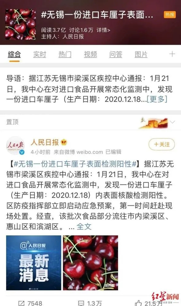 前幾日,進口車厘子降價的消息才讓不少人嘗了鮮,而此次車厘子表面被爆出核酸檢測陽性,也讓廣大網友直呼“有點怕”,該新聞一度登上微博熱搜,截至發稿前,閱讀量已超3億。