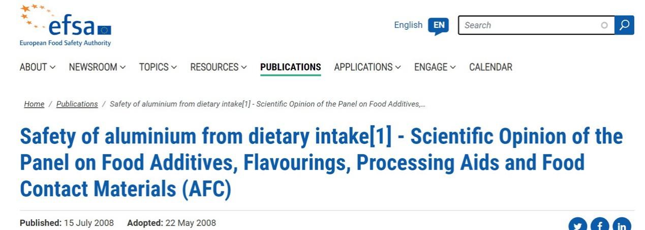 歐盟、中國和世界其他國家一樣,并不把鋁作為污染物管理。根據風險評估的結果,控制鋁主要是規范含鋁食品添加劑的使用,而不是控制食物中天然含有的鋁。