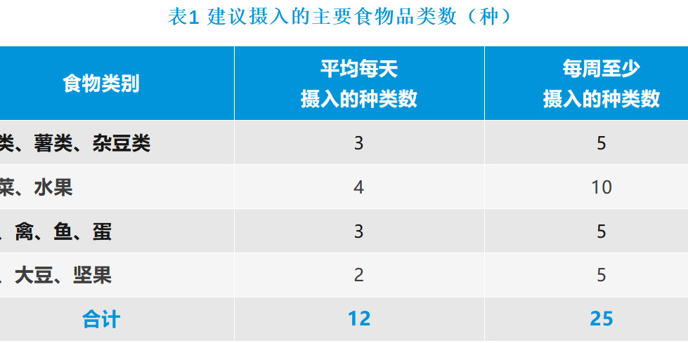 怎樣才算“多樣”呢?建議 :平均每天吃不同品種數達到 12 種以上,每周達到 25 種以上(表 1),烹調油和調味品不計算在內。
