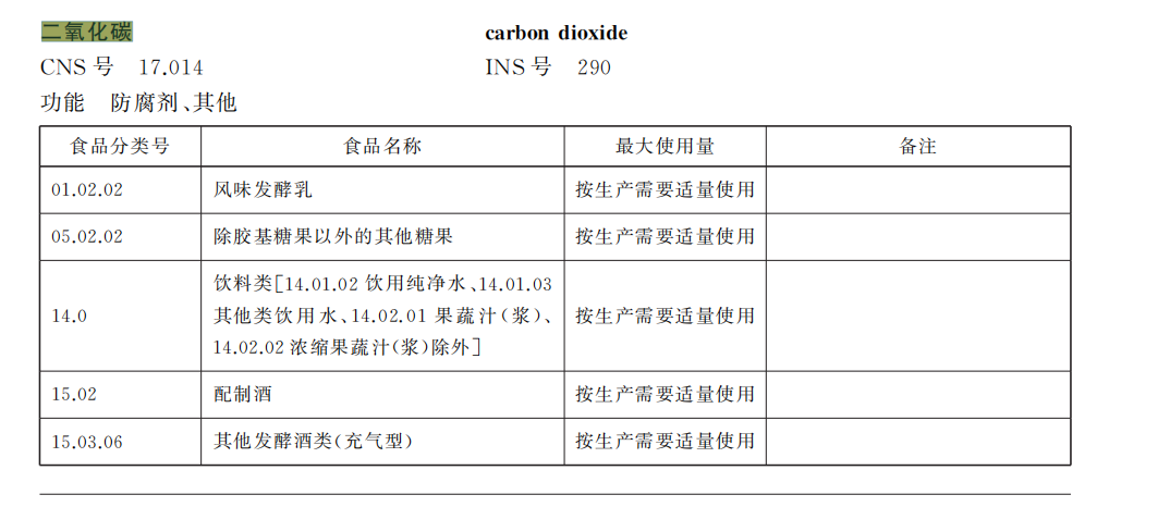 最近更新的食品安全國家標(biāo)準(zhǔn)GB 2760中就指出,二氧化碳可以作為一種食品添加劑用于食品中,功能為“防腐劑”“其他”。