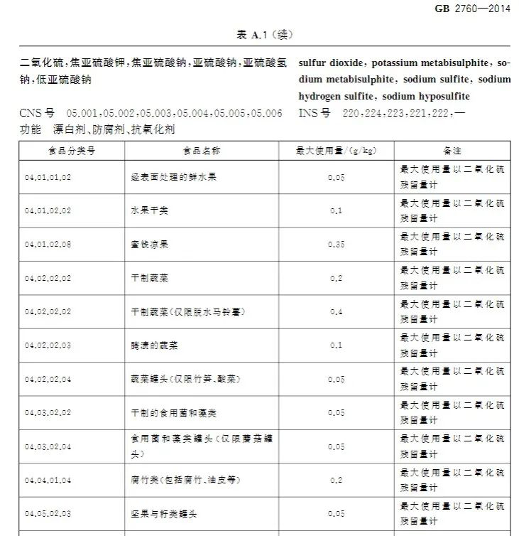 國家標(biāo)準(zhǔn) GB2760-2014 中硫磺的使用范圍