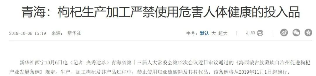 此外,這個事件中可能存在的問題是枸杞中的二氧化硫殘留量是否超標(biāo)。即便是用合法的添加劑,超標(biāo)也是要被查處的??上?,記者完全沒有給出檢測數(shù)據(jù),就直接給出了“硫過量”的判斷,這是非常不負(fù)責(zé)任的。