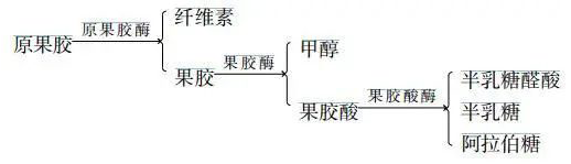 未成熟的水果中是原果膠,逐漸成熟后變成果膠,最后在水果后熟中,果膠被分解。
