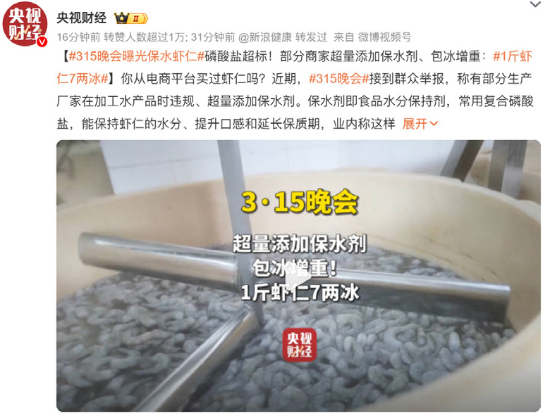 #315 晚會 # 曝光,部分生產廠家在加工水產品時違規、超量添加復合磷酸鹽保水劑,部分商家超量添加保水劑、包冰增重,1 斤蝦仁 7 兩冰。