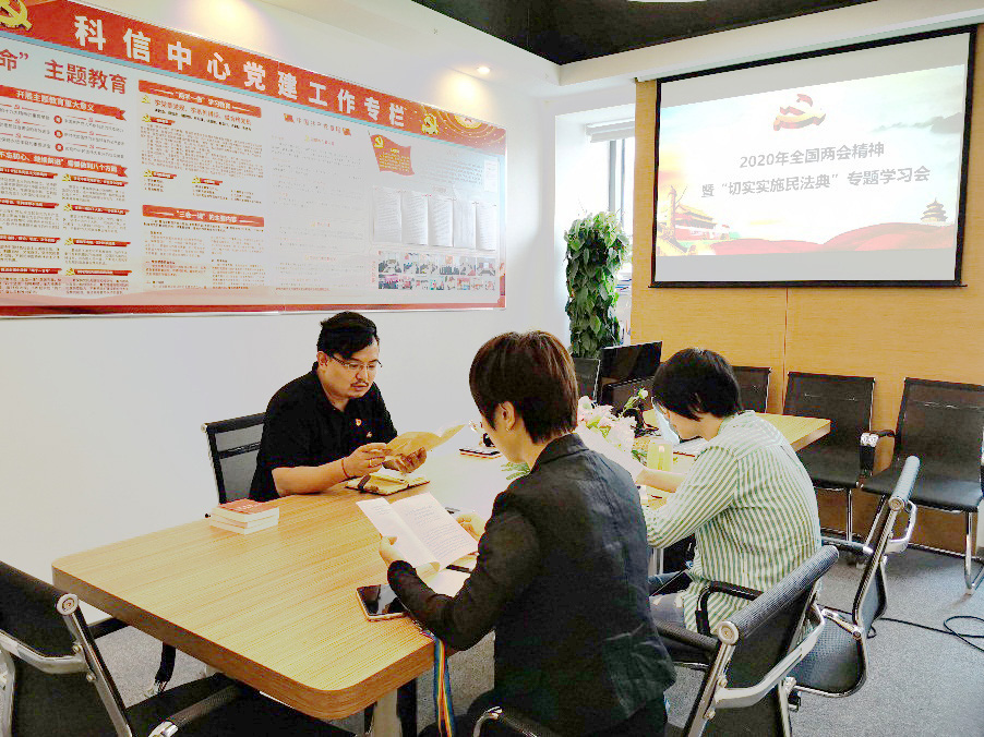 2020 年全國兩會精神暨“切實實施民法典”專題 學習會,科信中心黨支部全體黨員參加會議。黨 支部書記吳桐主持會議并講話。會上,大家認真 學習了十三屆全國人大三次會議、全國政協十三 屆三次會議精神。并逐一學習了政府工作報告、 全國人大涉港決定等重要文件。