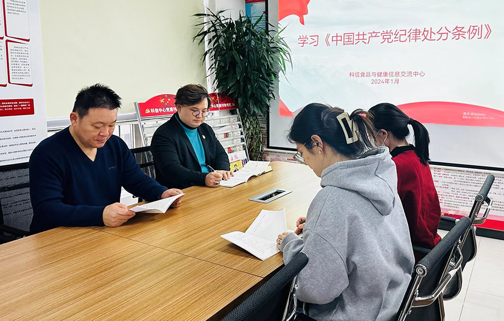 2024年1月1日,新修訂后的《中國共產黨紀律處分條例》(以下簡稱《條例》)正式實施,為了學習貫徹新修訂的《條例》,結合部管社會組織綜合黨委發放相關學習材料,1 月 16 日,科信中心黨支部組織全體黨員集中學習新修訂的《條例》。黨支部書記包大躍主持會議。