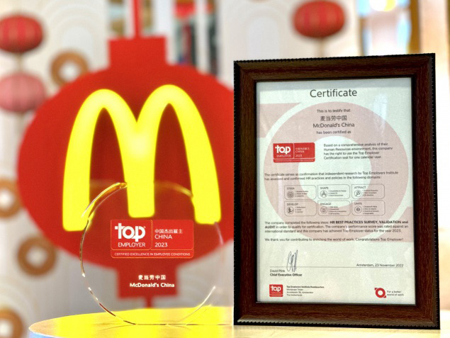 2023年1月17日,上海,麥當勞中國獲得由杰出雇主調研機構(Top Employers Institute)頒發的中國杰出雇主 2023認證。麥當勞中國以綠色增