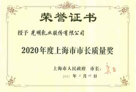 5 月 28 日上午,在 2021 年度上海市質量工作會議上頒發了 2020 年度上海市政府質量獎,光明乳業股份有限公司榮獲本市最高質量榮譽