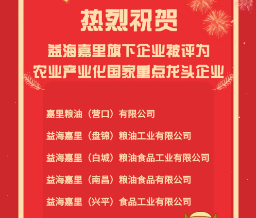 12 月 15 日,益海嘉里集團旗下 5 家企業被國家多部門聯合認定為農業產業化國家重點龍頭企業。它們分別是嘉里糧油(營口)有限公司、益海嘉里(盤錦)糧油工業有限公司、益海嘉里(白城)糧油食品工業有限公司、益海嘉里(南昌)糧油食品有限公司和益海嘉里(興平)食品工業有限公司。