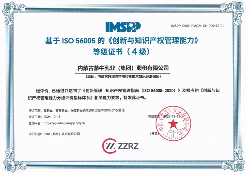 12 月 16 日,蒙牛集團獲得 ISO 56005《創新與知識產權管理能力》四級認證,成為中國乳制品、營養食品與保健品行業中首批獲得四級認定的企業!