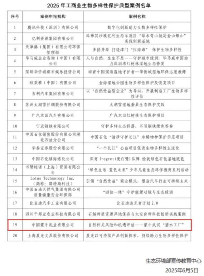 生態環境部宣傳教育中心公布了 2025 年工商業生物多樣性保護典型案例,蒙牛乳業《自然相關風險和機遇評估——蒙牛武漢“碧水工廠”》案例成功入選。這是乳品行業唯一獲評項目,彰顯了蒙牛在可持續發展領域的行業標桿地位。